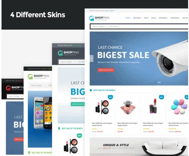 The theme comes with 4 different skins, which is to say that there are different color schemes for the theme layout. It also comes with some great plugins, such as Visual Composer which can be used to customize or create WooCommerce/WordPress pages from scratch, and Slider Revolution which is useful for creating attractive slideshows.