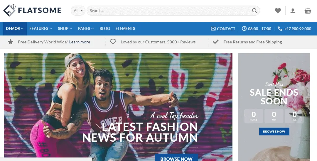 With more than 70,000 sales on ThemeForest, Flatsome is by far the best-selling theme we’ve come across. It comes with more than 300 pre-built site templates, so there’s a high chance you’ll find a layout that will fit the vision for your ecommerce shop.