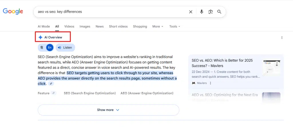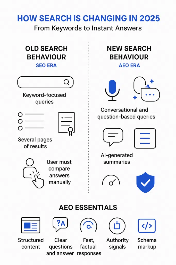That shift? It’s the AEO vs SEO difference, and it’s becoming one of the biggest challenges businesses face right now.