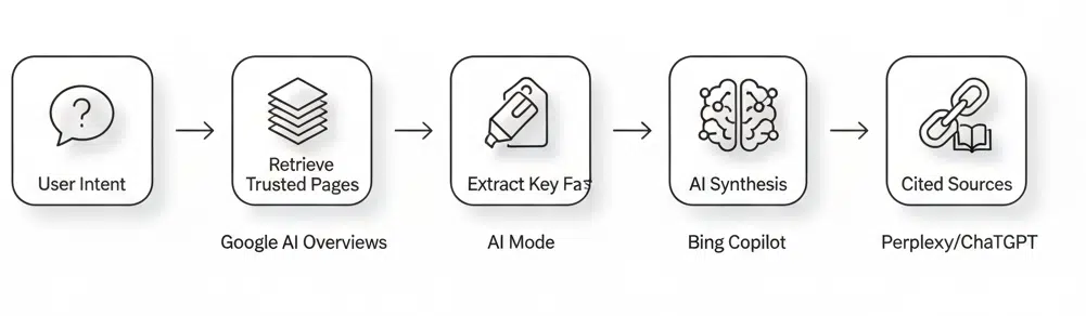 Here’s how AEO works today. The engines behind AI Overviews, AI Mode, Bing Copilot, and chatbots use the same simple pipeline: they read the intent in your question, retrieve trusted pages, extract the key facts, synthesize a clean answer, then cite sources for LLM citations. This mirrors what Google outlines in its official guide on how AI Overviews generate answers.