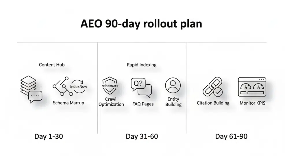 This AEO implementation plan breaks into three stages that stack cleanly. It’s practical, trackable, and built to move with your current team.