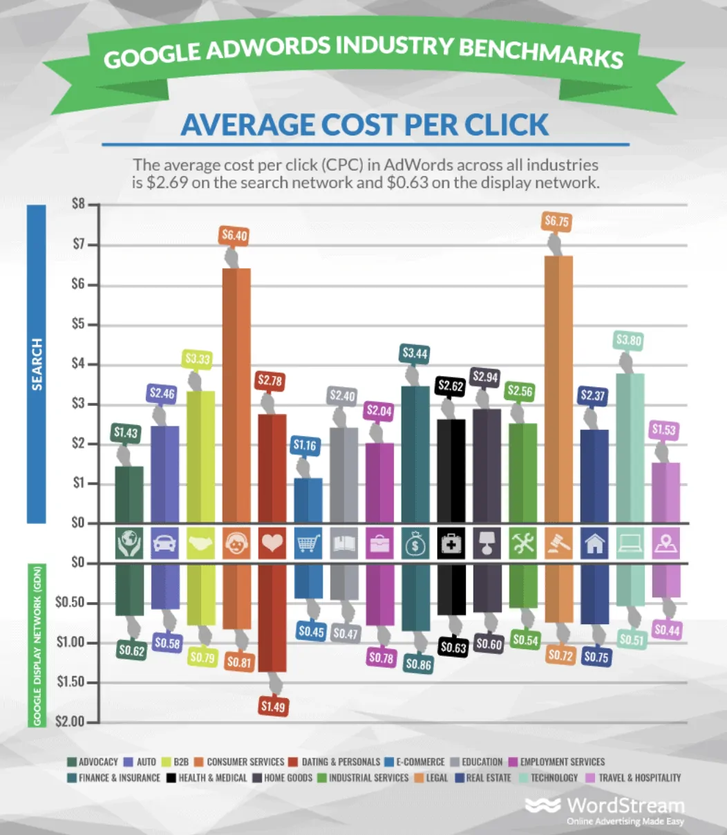 Average Cost Per Click on Google AdWords (now called Google Ads) by Industry: