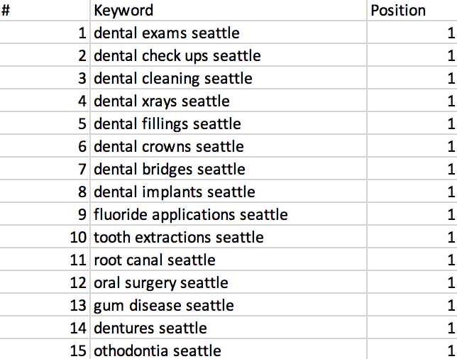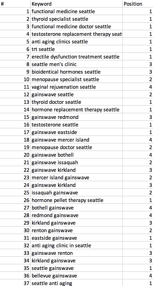 Take a look at a Microsoft Excel report of Dr. Kate Kass’s first page keywords: