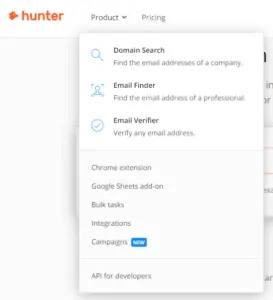 You can access Hunter’s other features by clicking on the ‘Product’ tab in the top navigation.
