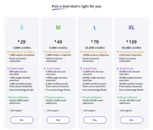 Which means if it returns an email addresses that cannot be used, you won’t spend any credits for it. It’s priced similarly to Hunter, as you can see: