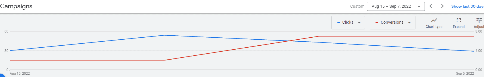 Watch as the cost per lead line (blue) goes does and the conversions (red) increases, this is just one 30 day period