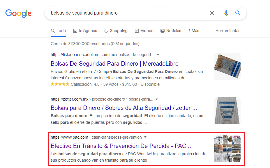 ‘bolsas de seguridad para dinero’ – Rank three on page one