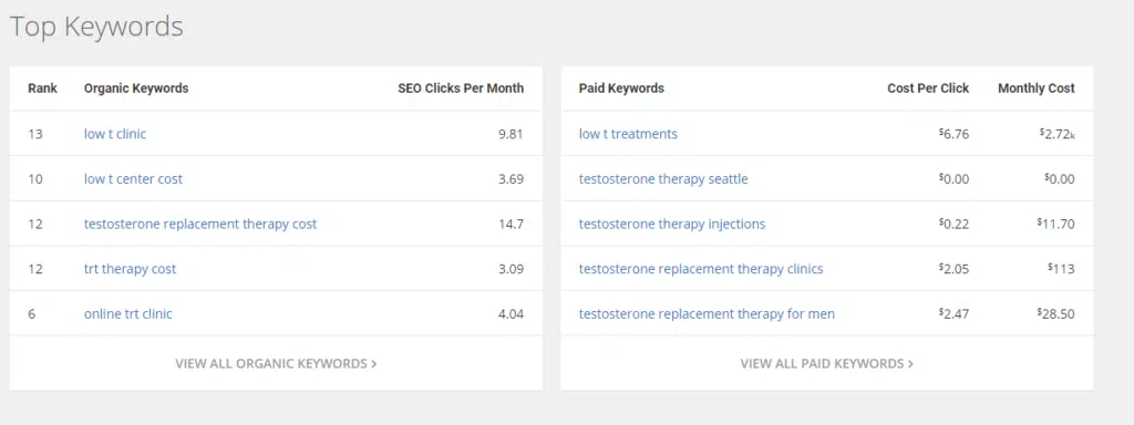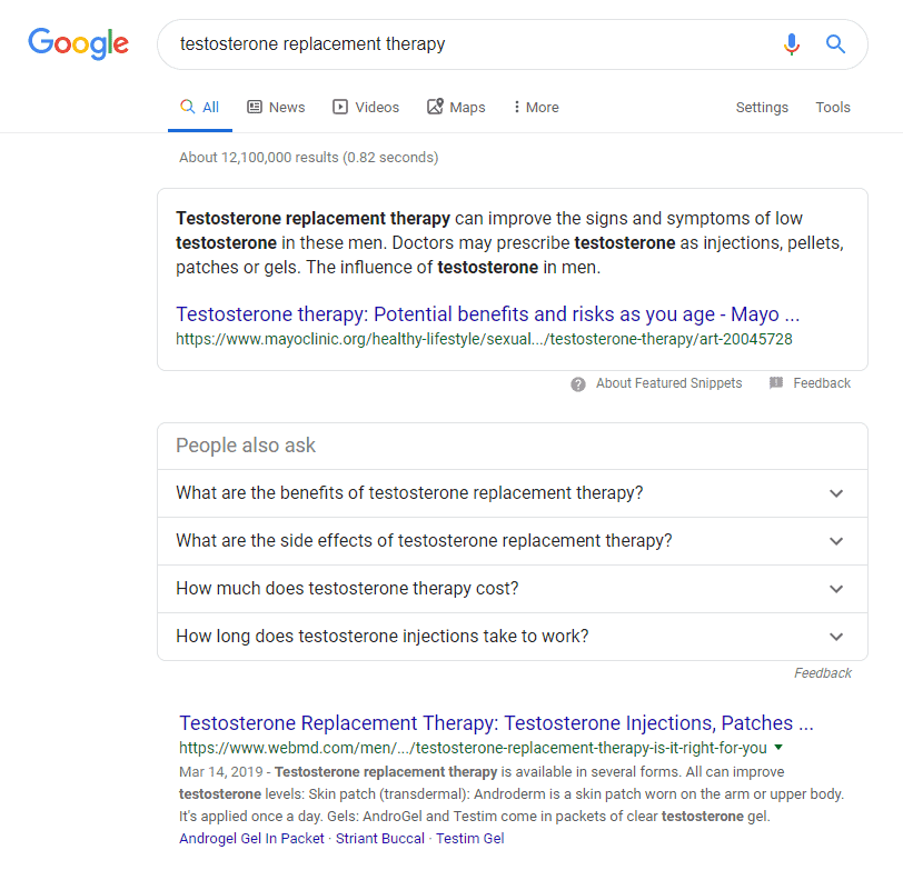 A keyword is a word that describes the content on your page best. For example, a page about testosterone replacement therapy will have that focused as its main keyword. All the information on this “testosterone replacement therapy” page should be on that topic.