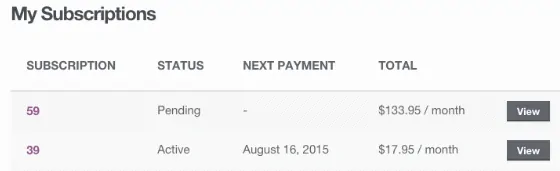 The plugin comes with a comprehensive set of subscription management options, allowing you to know the status of each individual subscription in great detail. Simply navigate to Subscriptions from your WooCommerce admin and for each subscription, you’ll find information for its current status, payment amount, start date, trial end date, next payment date and so on.